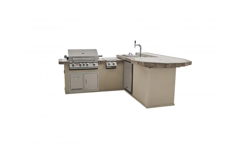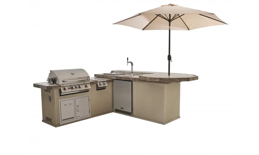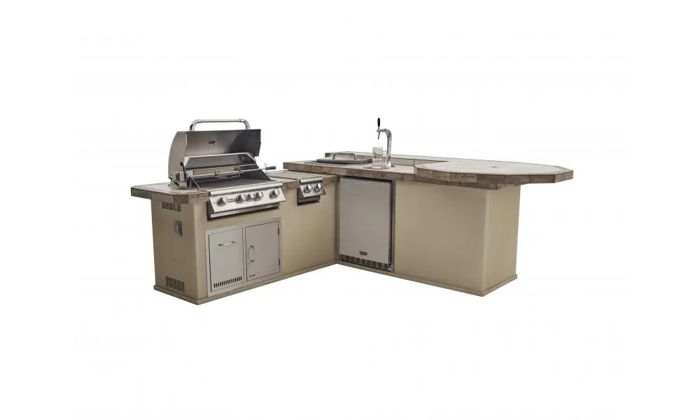 This outdoor island kitchen features a stainless steel gas grill and refrigerator for serving only the best food and drinks to your guests.