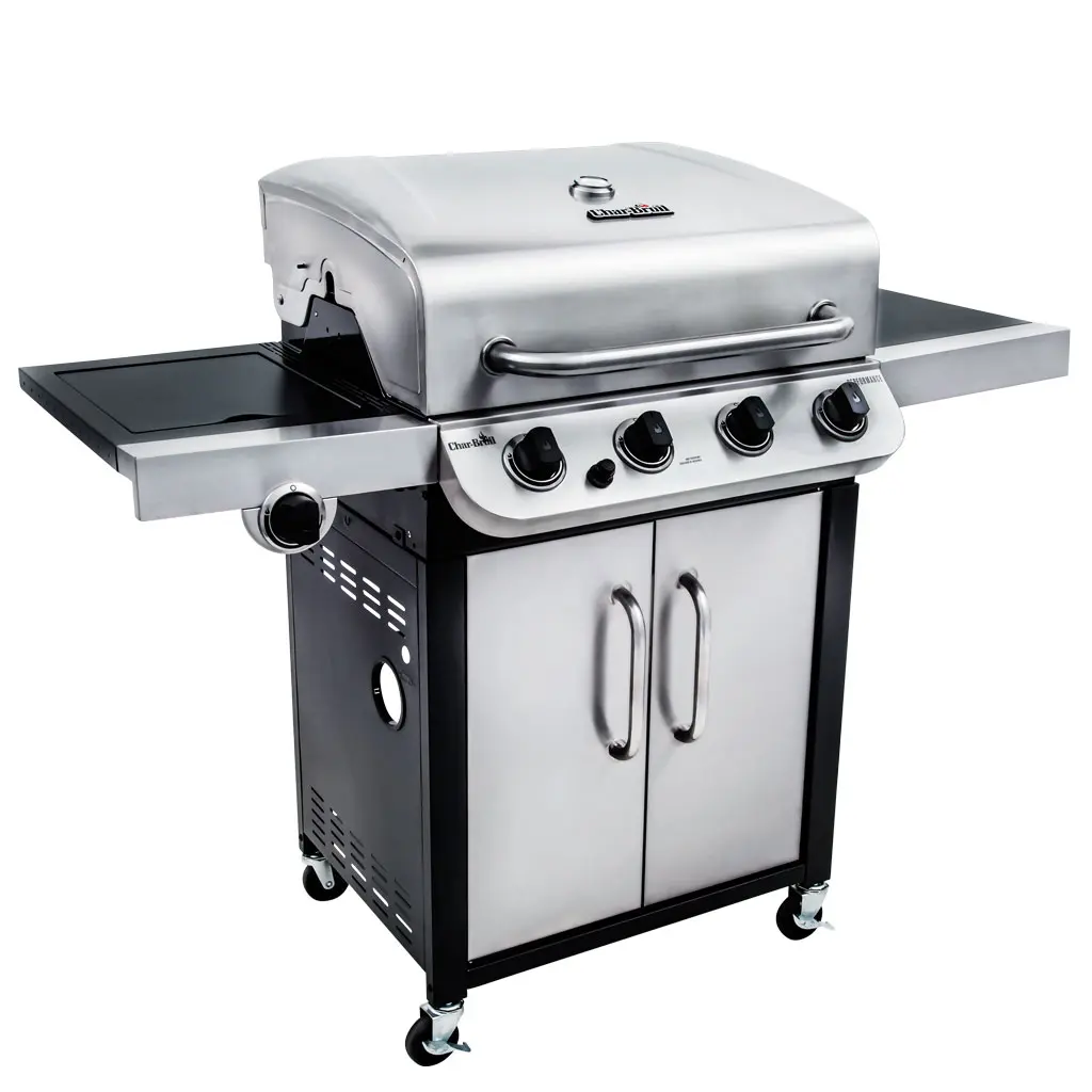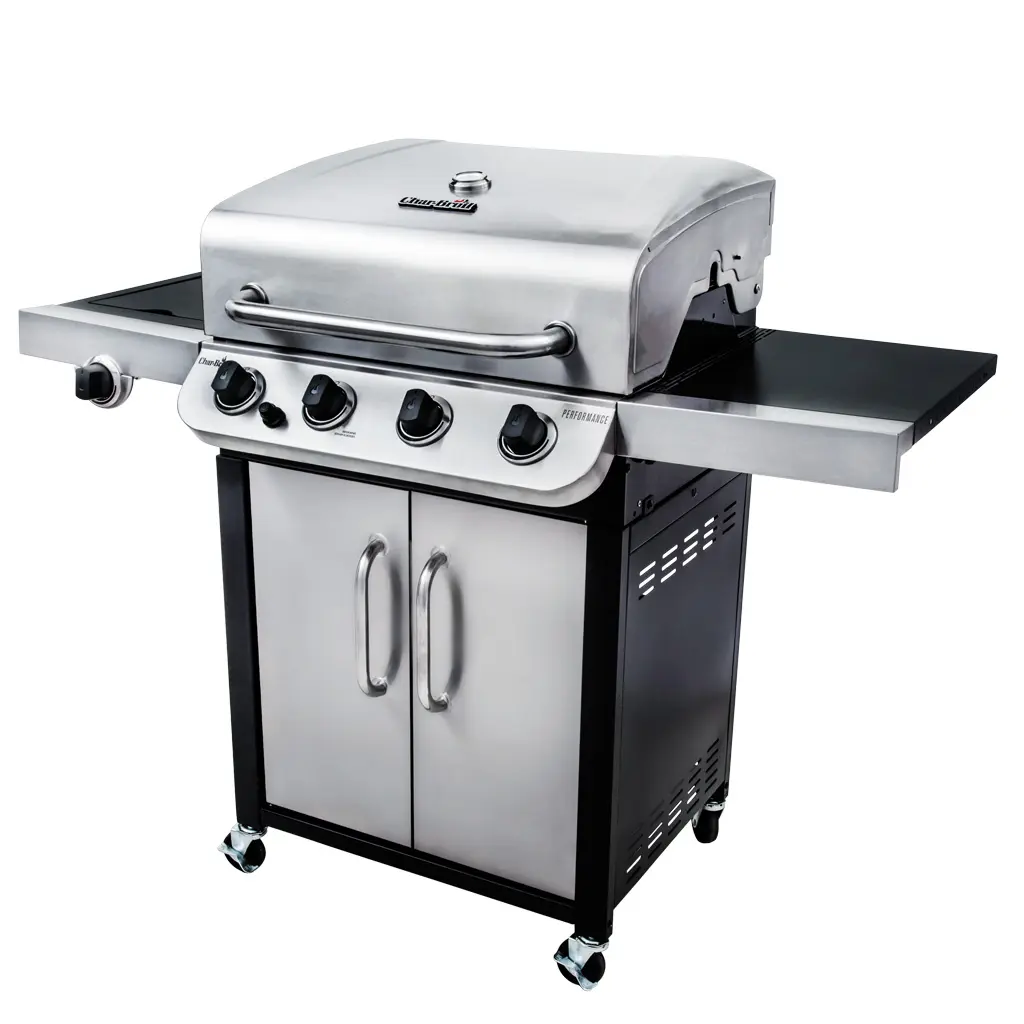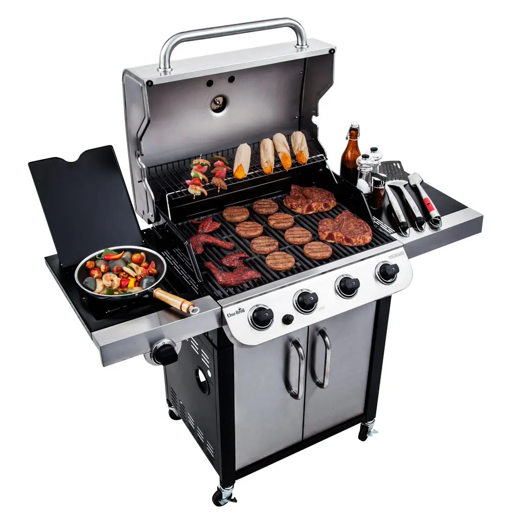 Made to last, the Performance™ 4-burner grill features a sleek black & stainless steel design, stainless steel burners & porcelain-coated grates.