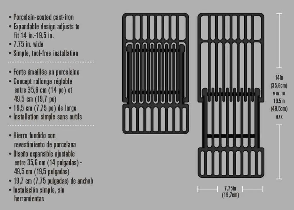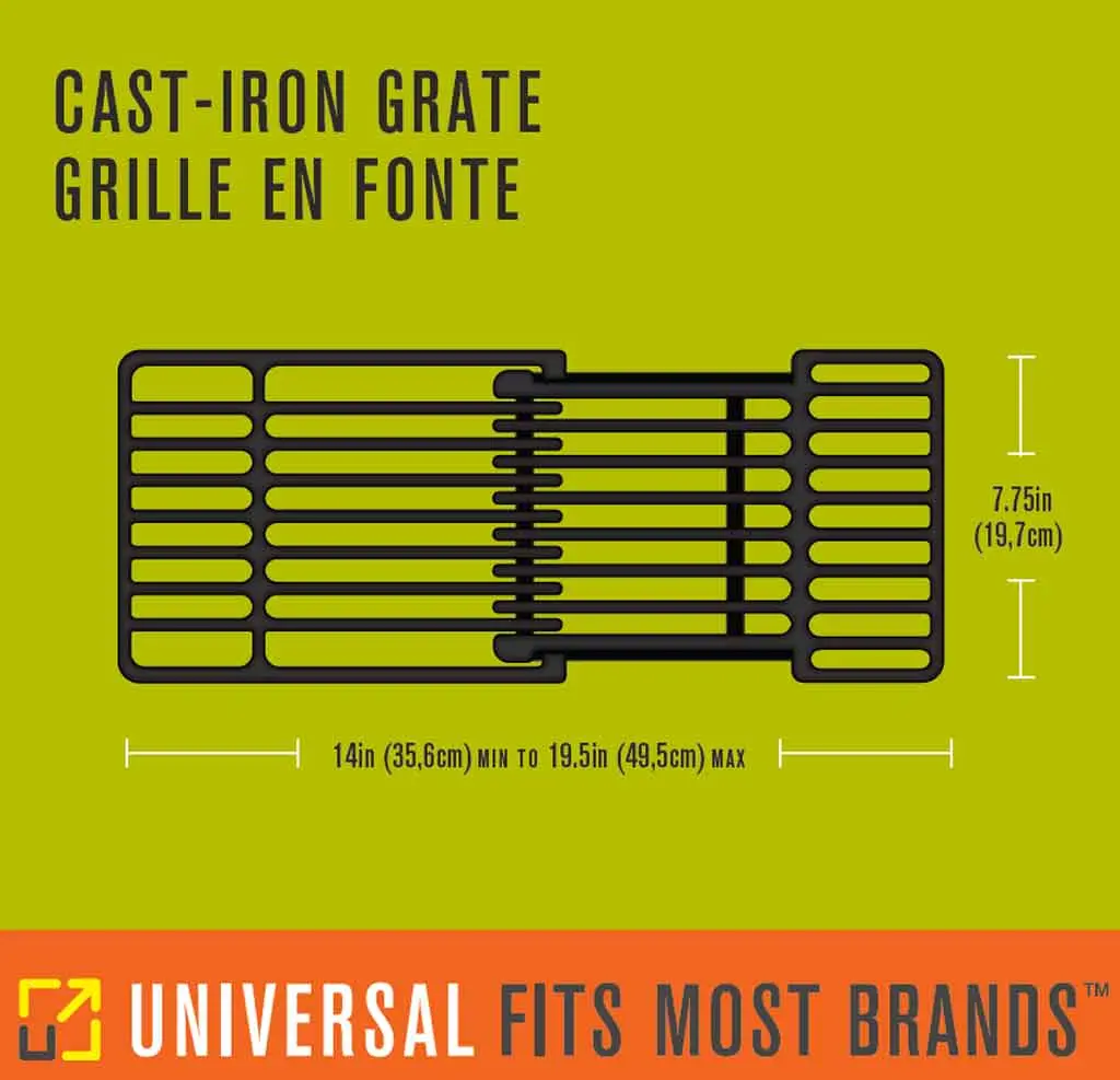 This universal cast iron grate adjusts to fit grills from 14″ to 19.5″ (35.56 cm to 49,53 cm) and includes multiple mounting options. Check your grill owner’s manual to make sure it will fit.