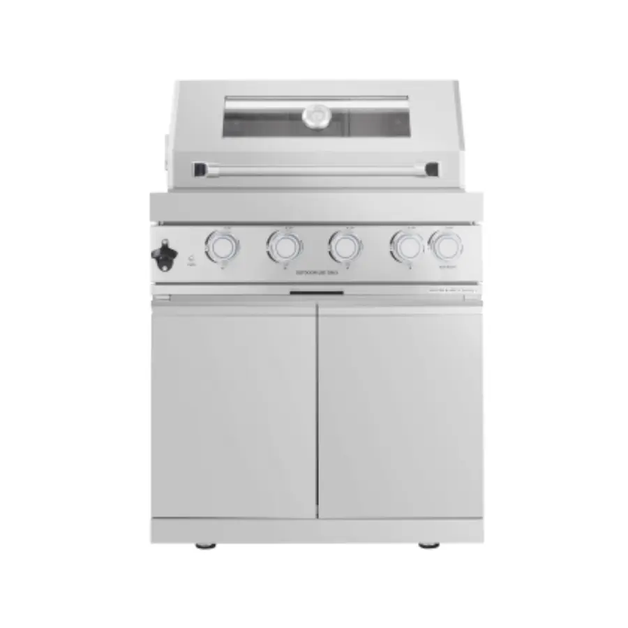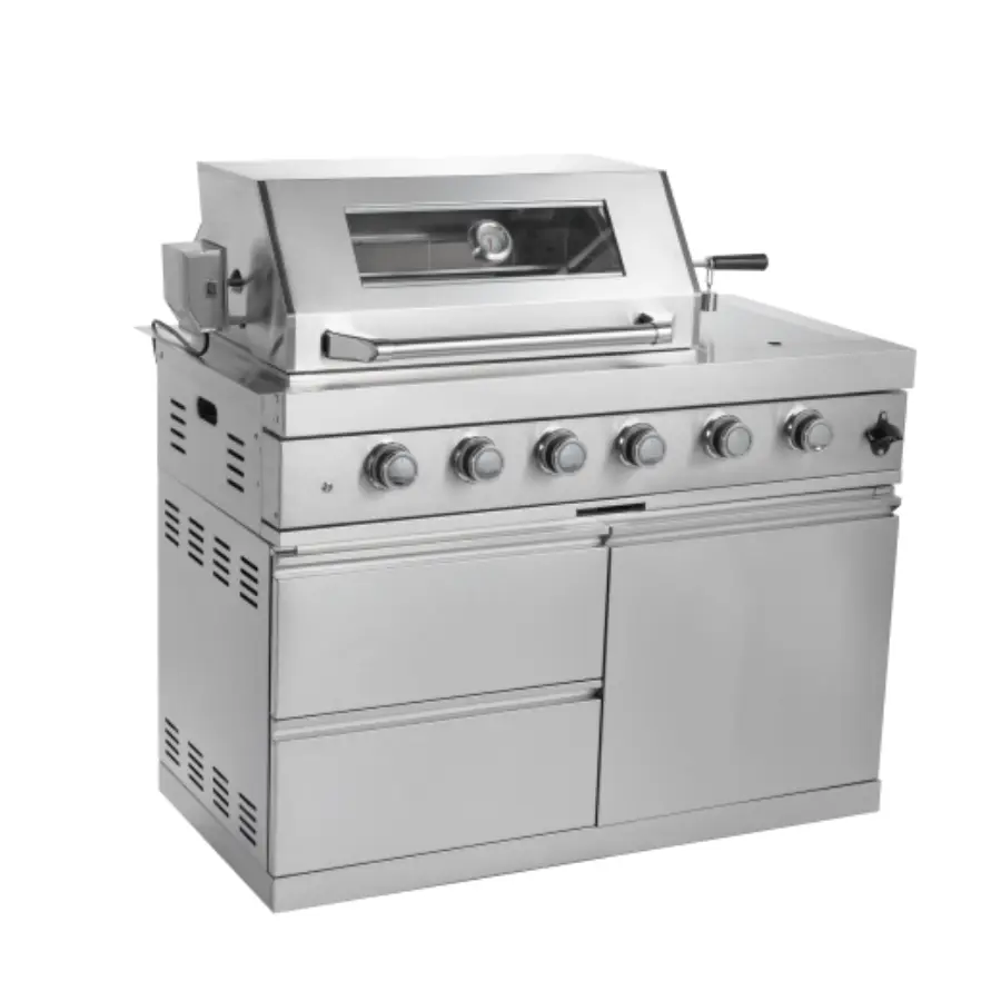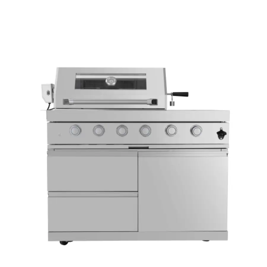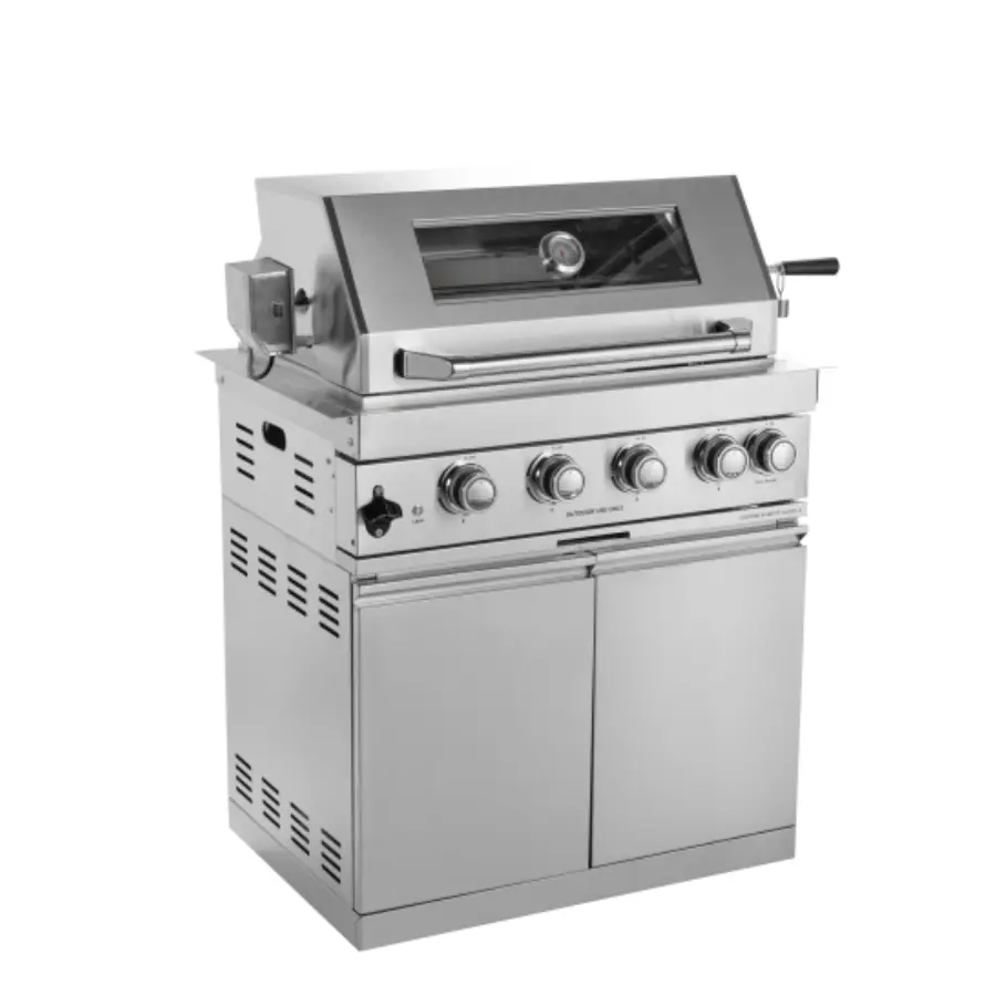 The Gusto 4-burner gas grill built-in is perfect for high-end outdoor kitchens, offering an exceptional cooking experience with a modern design and advanced features. With 4 adjustable burners, the spacious cooking area allows you to prepare multiple dishes at once. The heat-resistant glass door and built-in thermometer on the lid enable you to monitor the cooking process without losing heat. Made of durable 304 stainless steel, combined with a convenient storage cabinet and integrated rotisserie, it ensures high performance and easy storage.