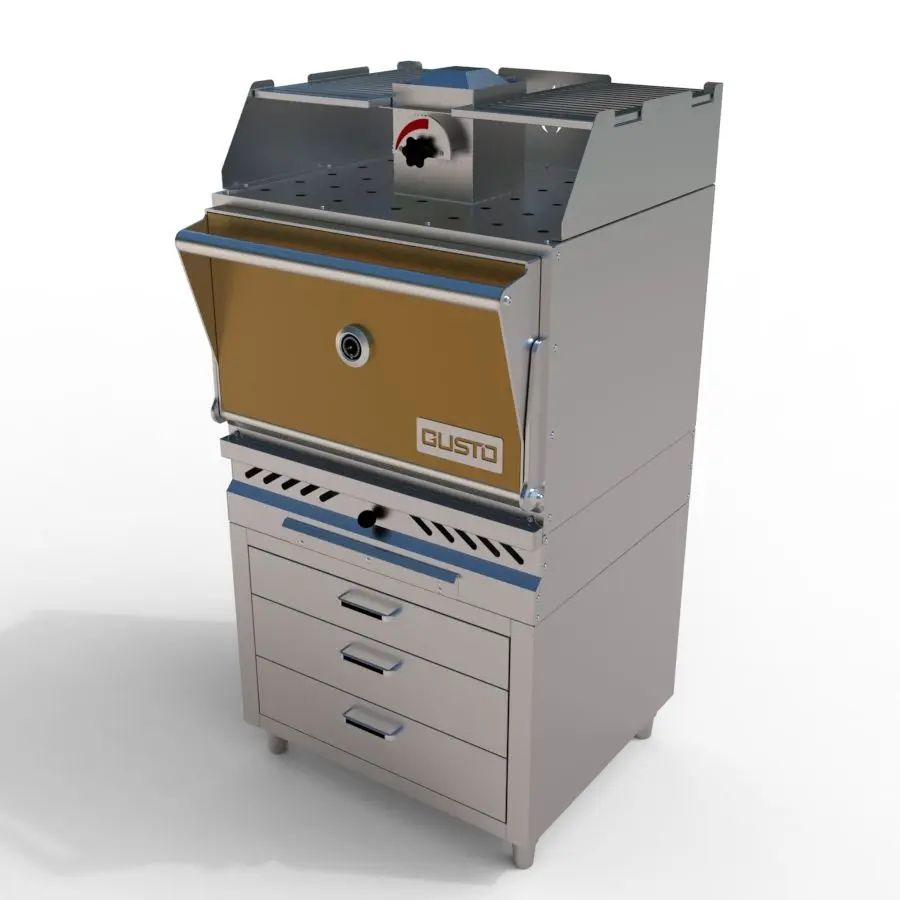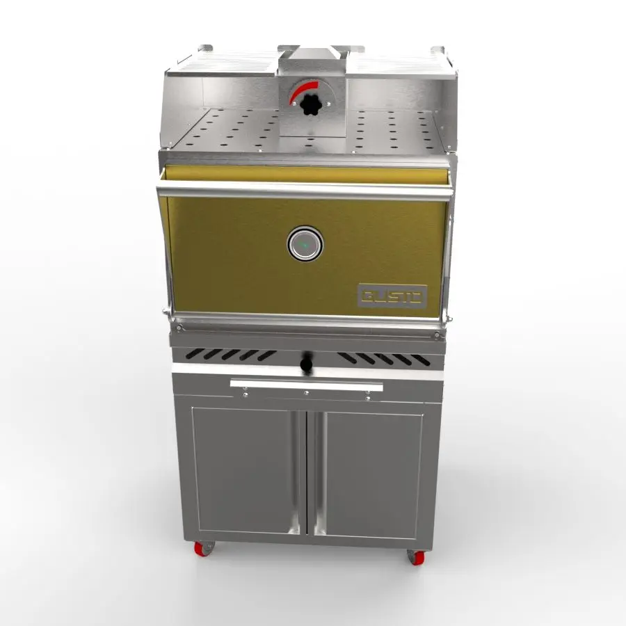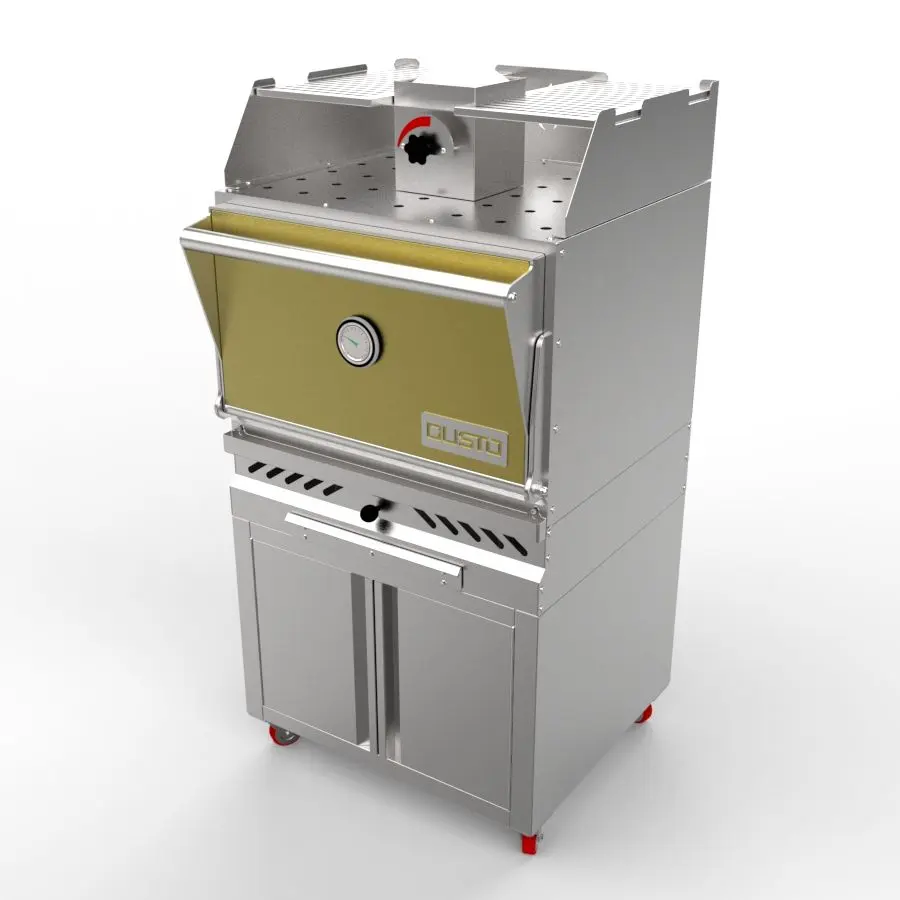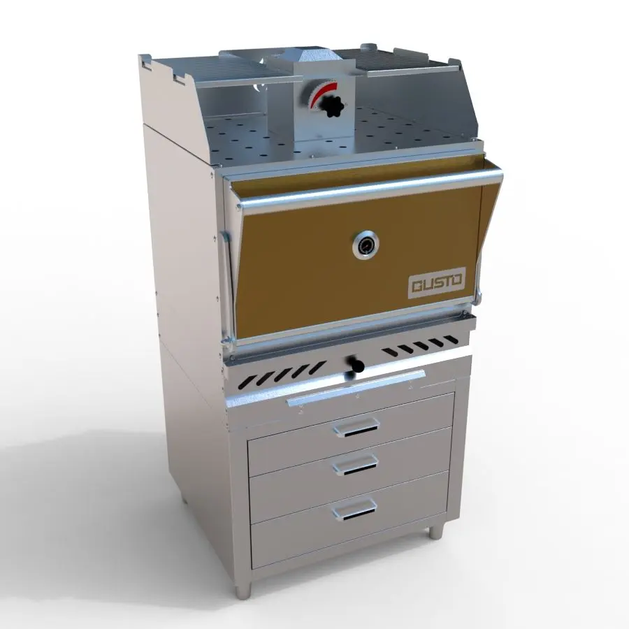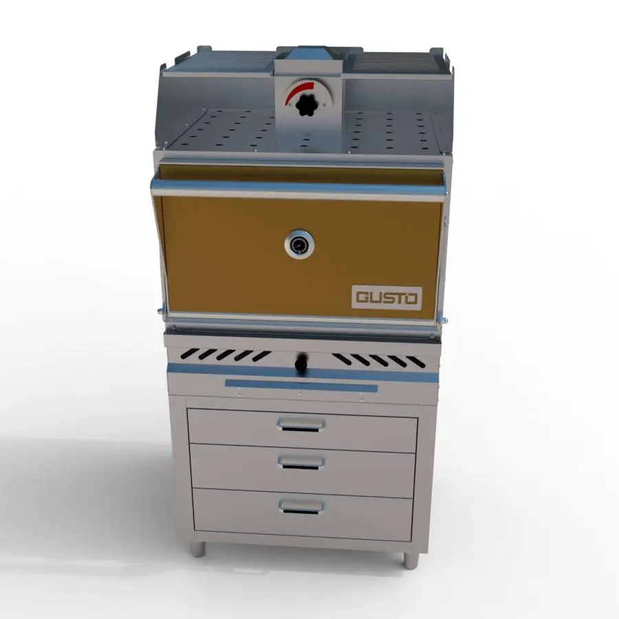 The Gusto commercial charcoal oven grill is designed for European-style restaurants, with a closed design that reaches high temperatures for perfect grilling results – crispy and golden on the outside, tender and juicy on the inside. Its optimized system features a grease tray, ash collector, special chimney, and convenient storage cabinet, ensuring efficient, clean, and professional grilling performance. Built with thick, durable materials, the oven delivers stable operation under heavy-duty use and long-lasting efficiency.