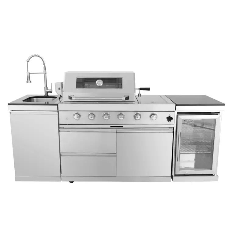The Gusto Elite Outdoor BBQ Kitchen island is a premium outdoor cooking solution, integrating a 6-burner gas grill, stainless steel sink, and built-in refrigerator into a seamless modular design.