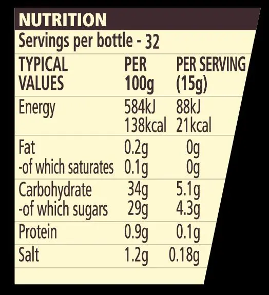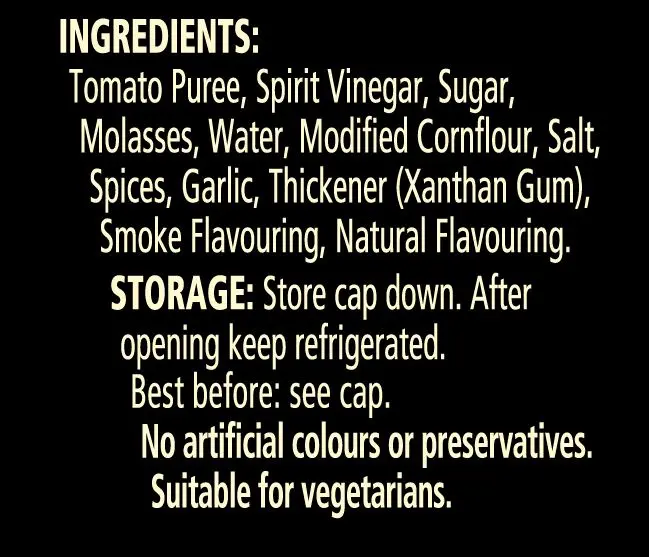 Tomato Puree, Spirit Vinegar, Sugar, Molasses, Water, Modified Cornflour, Salt, Spices, Garlic, Thickener (Xanthan Gum), Smoke Flavouring, Flavourings