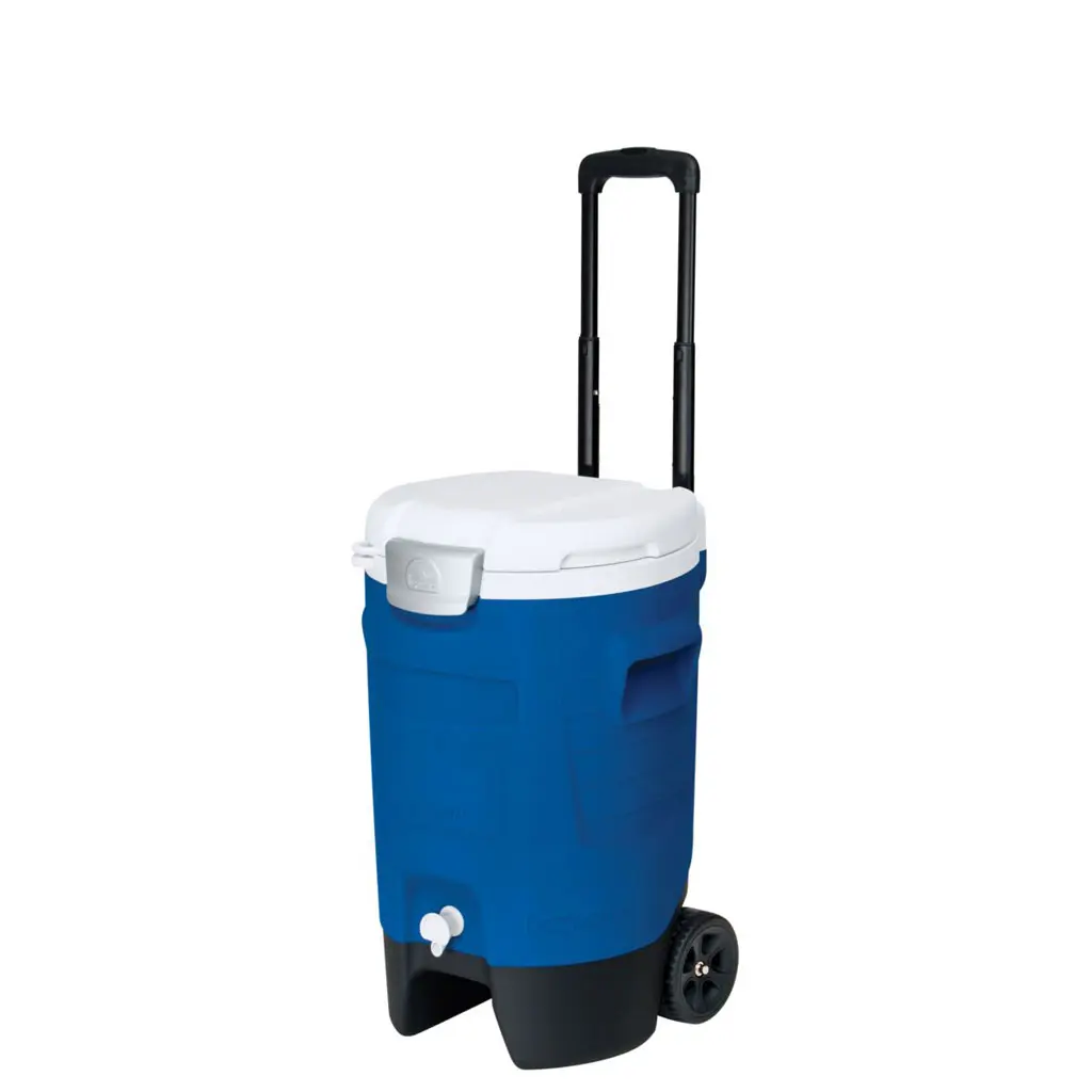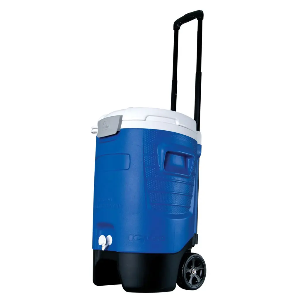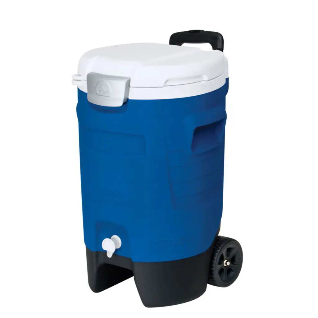 Locking telescoping handle with wide inset wheels lightens full beverage jug carrying load for easy transport to and from games