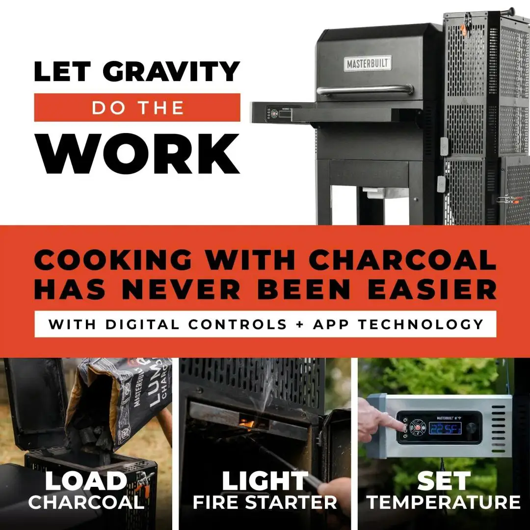- GravityFed™ charcoal system: Automatically feeds charcoal, maintaining consistent heat for hours without constant monitoring