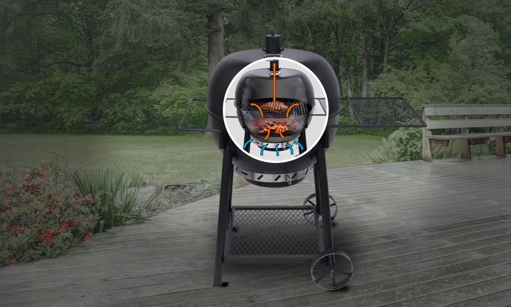 - Hinged lid for easy food and charcoal access