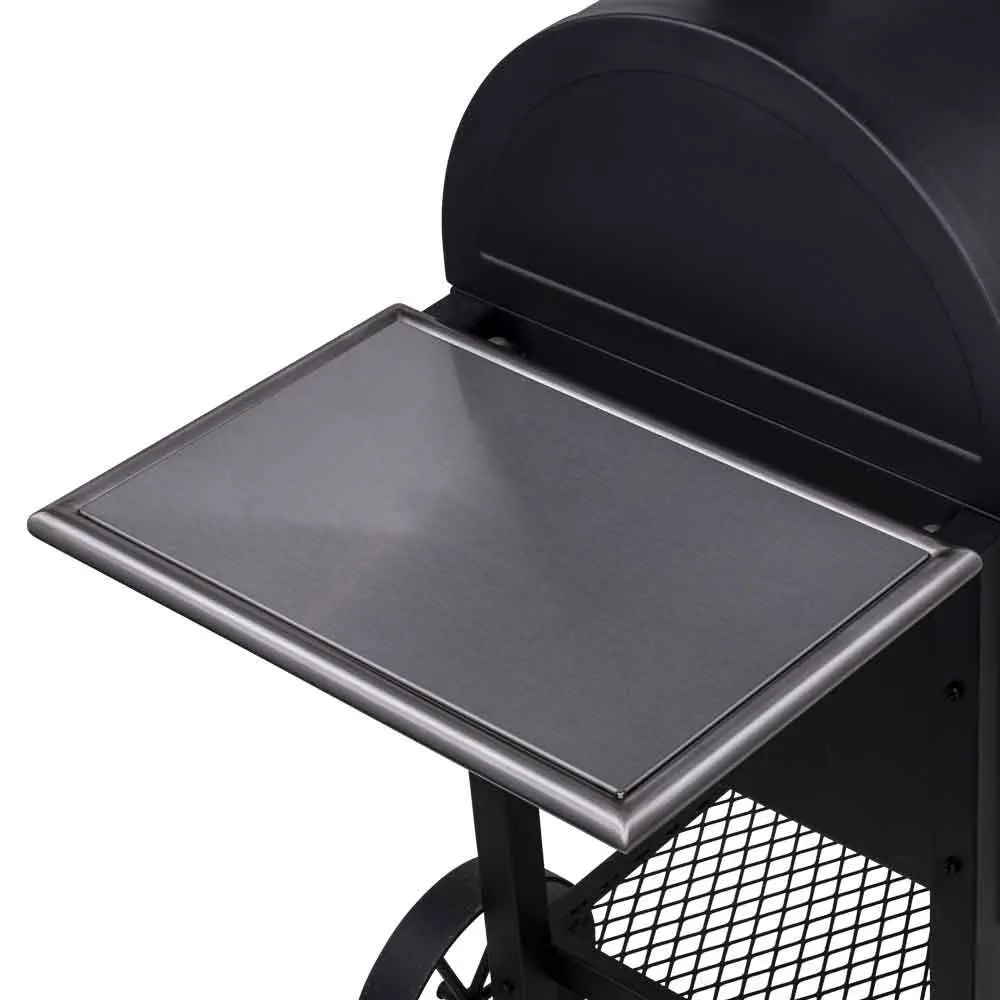 Heavy-duty stainless steel side shelves for food prep and easy access to tools
