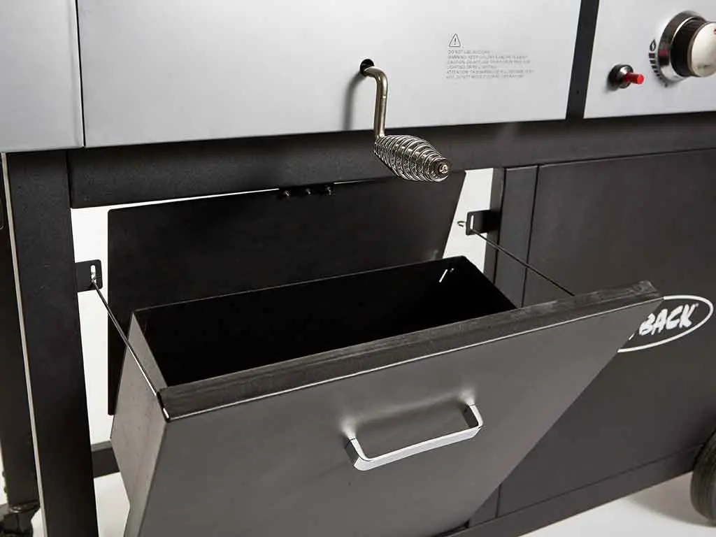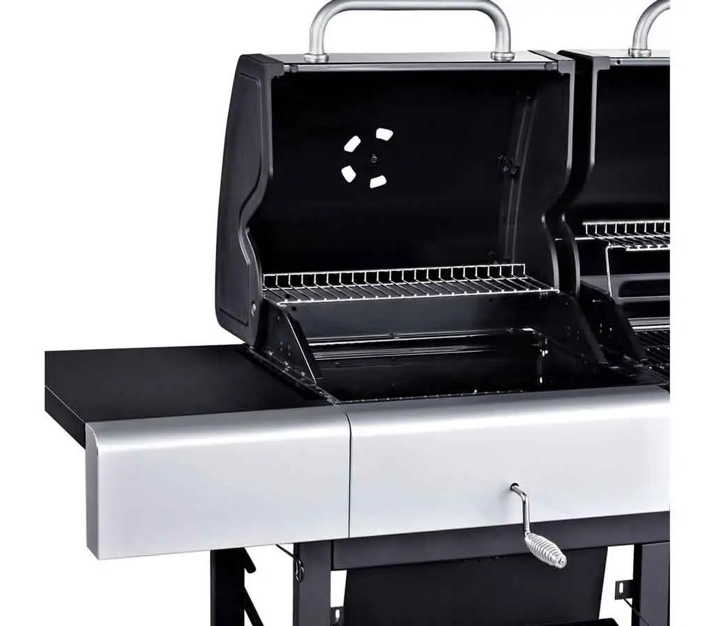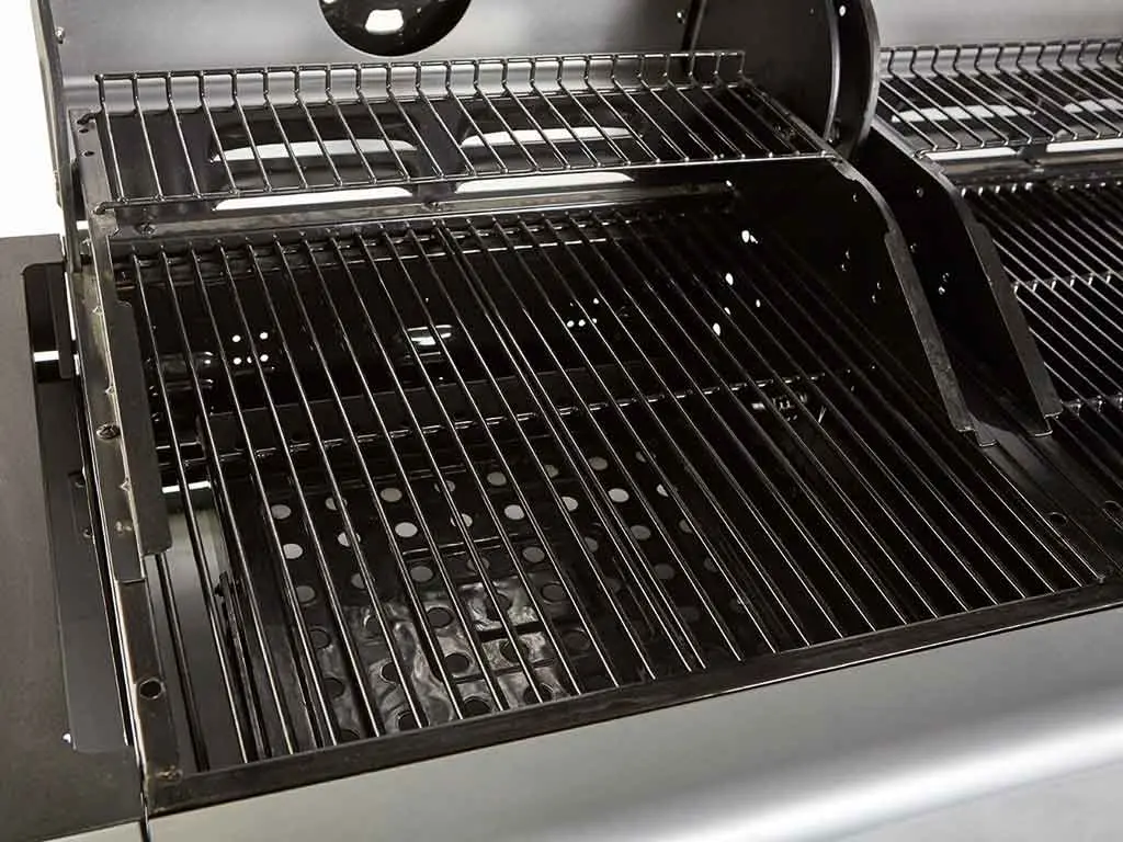 Porcelain-enamelled roasting hoods, 2 x cast iron grills, adjustable warming racks, side tables, air vents, piezo ignition and bottle opener – together with a charcoal cooking area of 480mm x 420mm and 640mm x 420mm when using gas – make this barbecue the complete package.