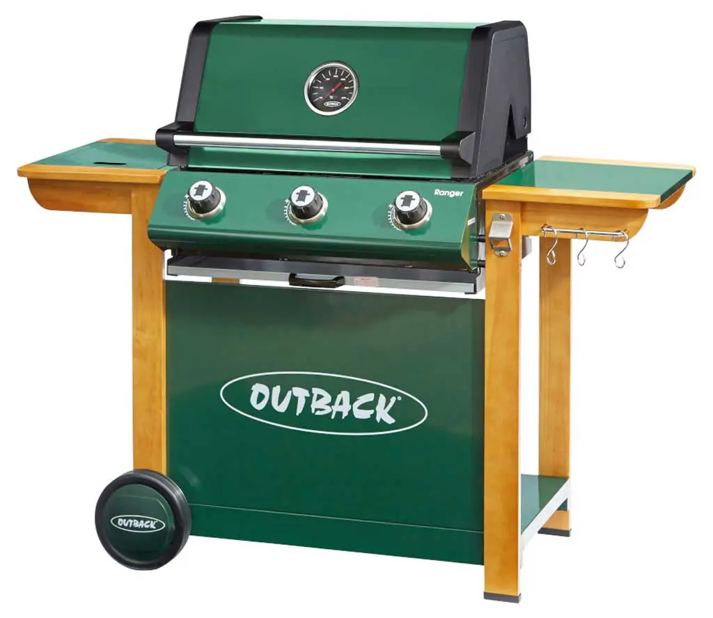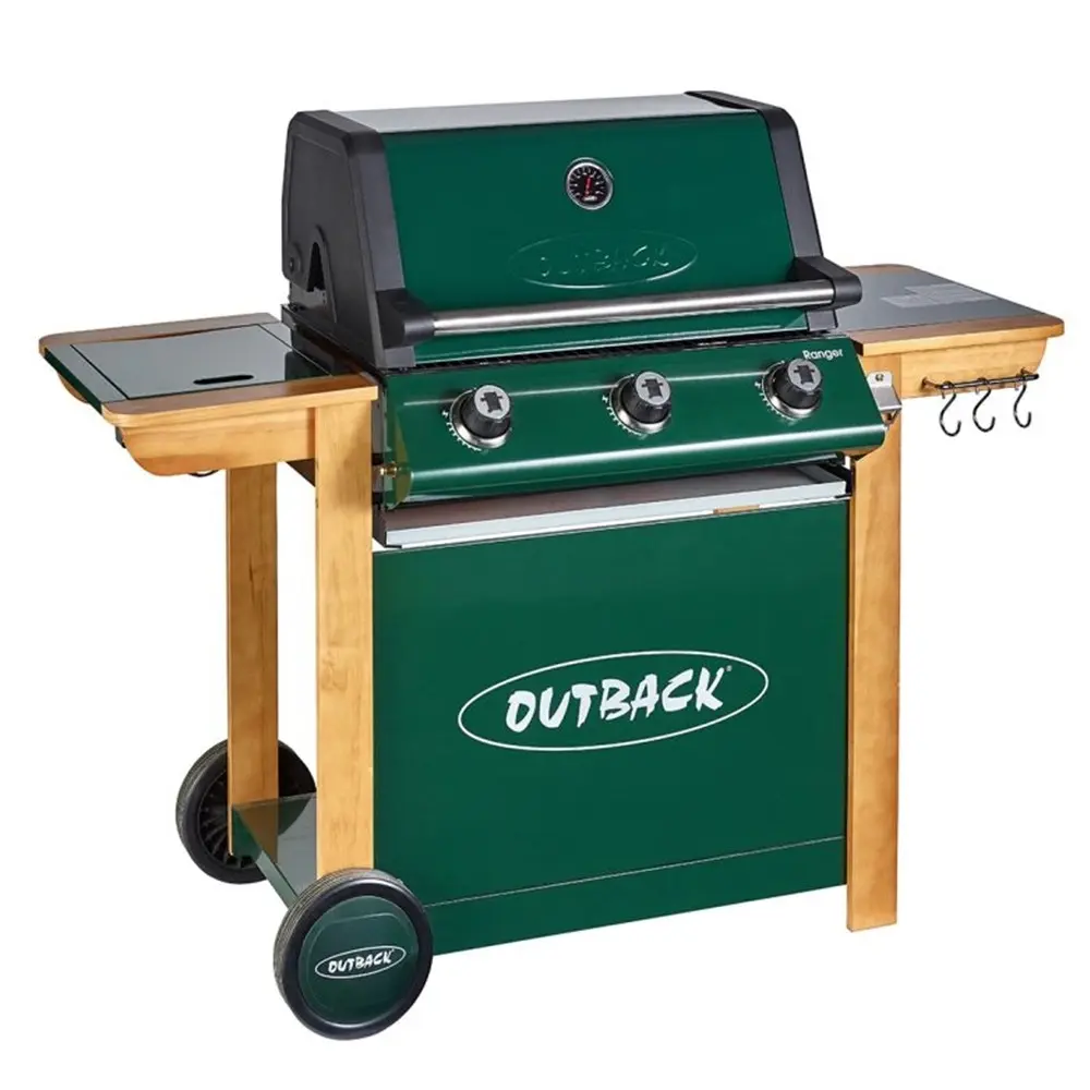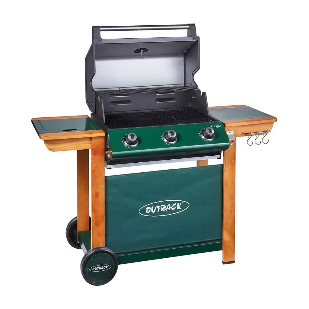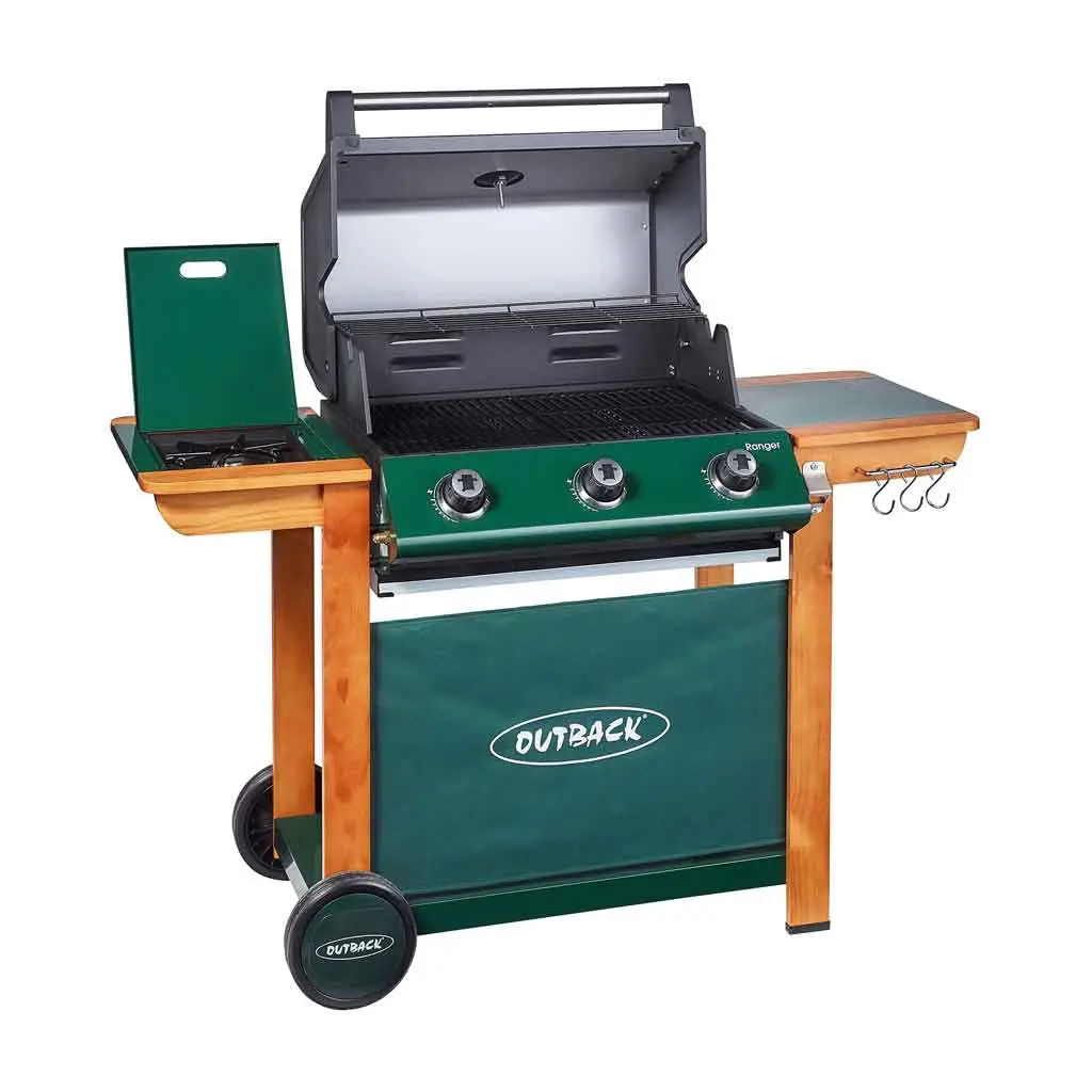 In a traditional country green and wooden frame, the Outback Ranger has a new side burner and roasting hood with recessed heat gauge, three stainless steel burners giving extra heat retention in the double grill, integral spark rotary ignition and free propane gas regulator.