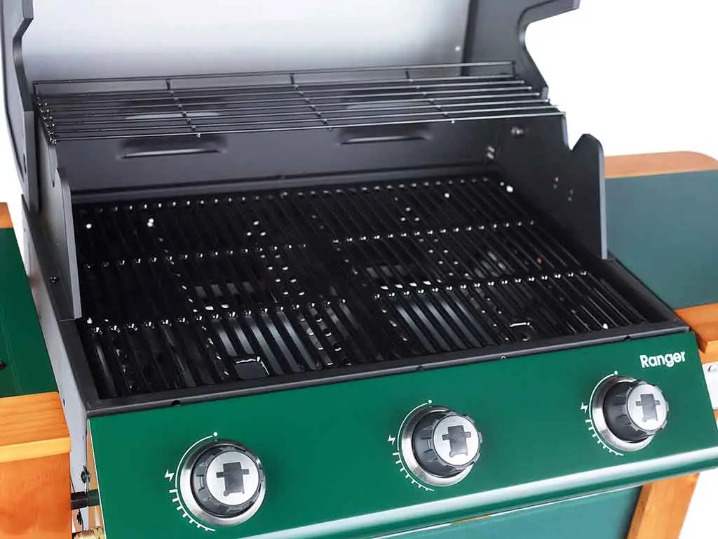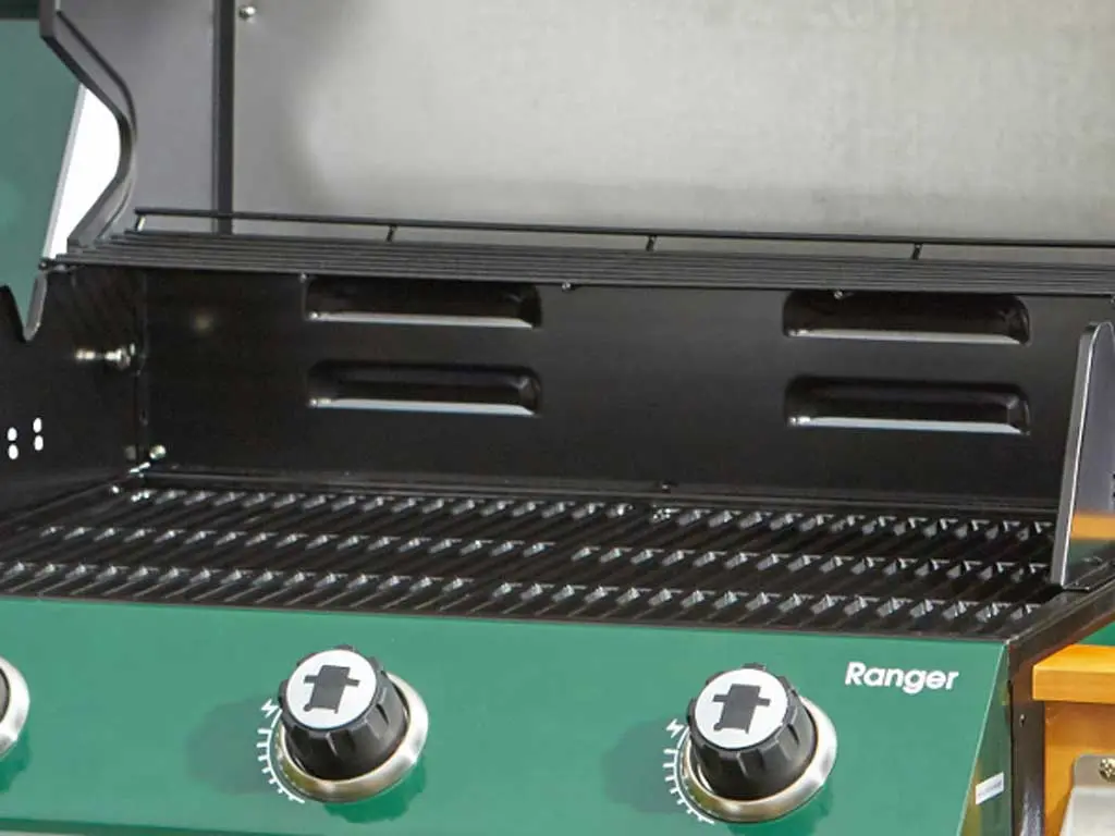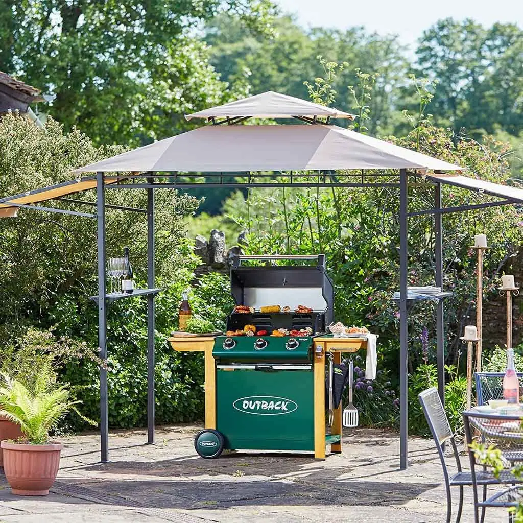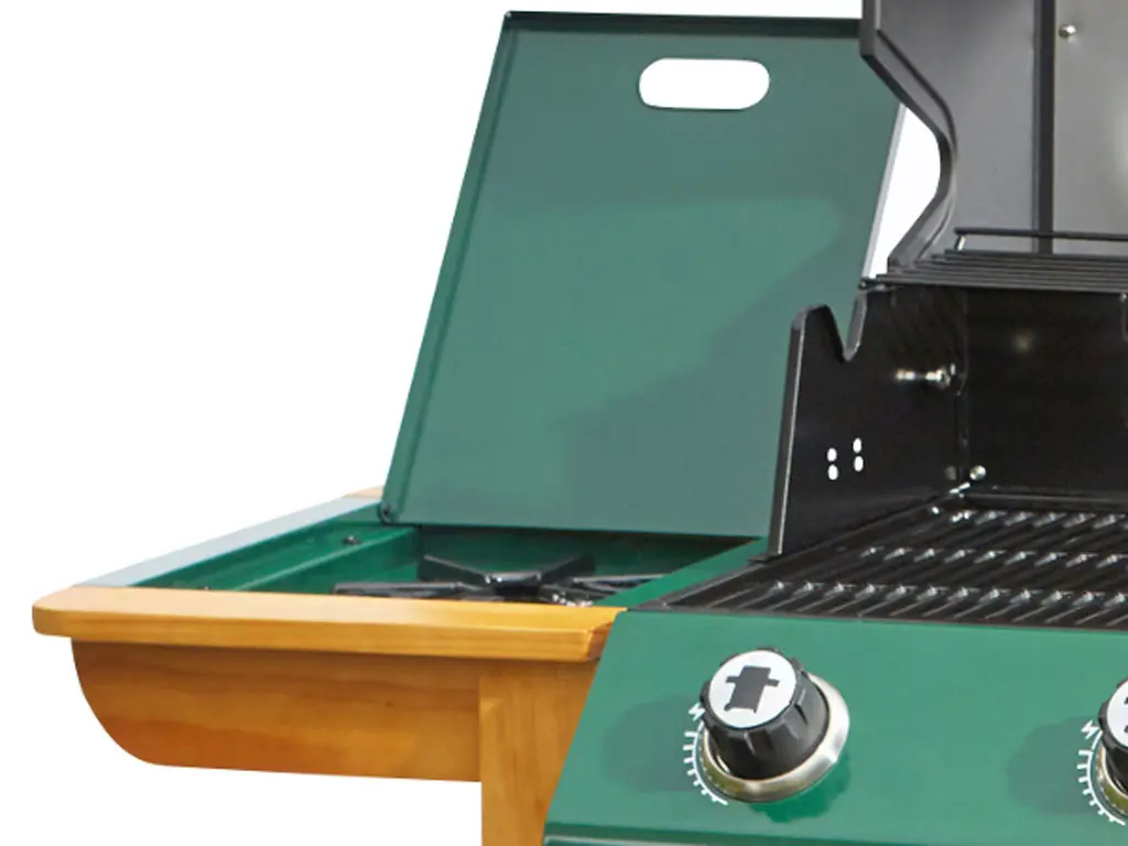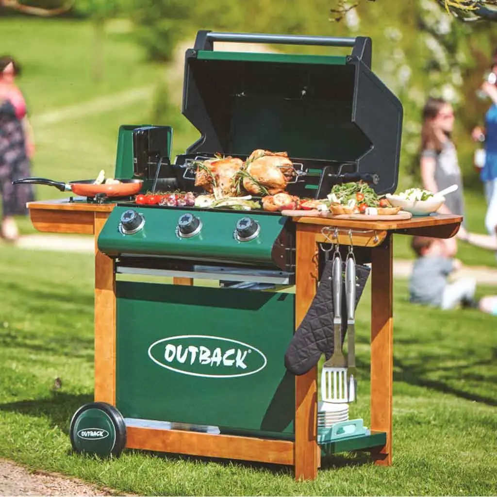 In a traditional country green and wooden frame, the Outback Ranger has a new side burner and roasting hood with recessed heat gauge, three stainless steel burners giving extra heat retention in the double grill, integral spark rotary ignition and free propane gas regulator.