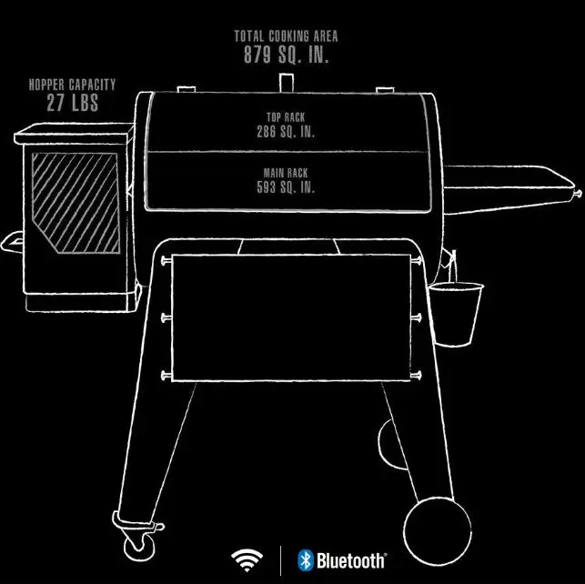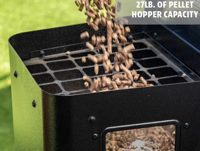 28-pound hopper capacity with pellet door cleanout; fueled by 100% hardwood pellets