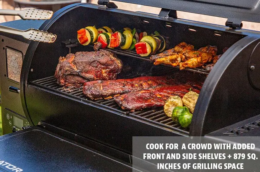 879 square inches of cooking surface; porcelain-coated cast iron cooking grates