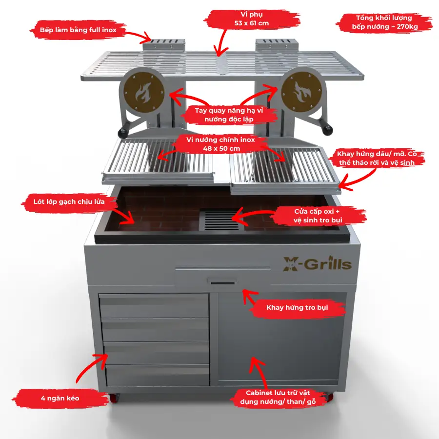 Hệ thống vỉ nướng nâng hạ độc lập giúp đầu bếp dễ dàng điều chỉnh khoảng cách với than để kiểm soát nhiệt độ nướng chính xác. Kết hợp cùng khay hứng dầu, khay tro và vỉ hâm giữ nóng, bếp mang lại hiệu suất nướng ổn định và hương vị nướng than tự nhiên chuẩn steakhouse.